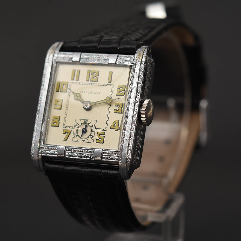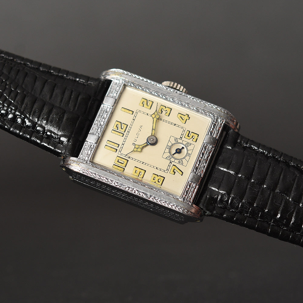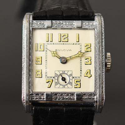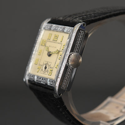 empressissi™ is pleased to offer this early and sought after Art Deco BULOVA wrist watch for men known as the 'Fleetwood' model from the late 20s in white gold filled case with a classic Art Deco design.