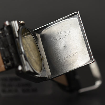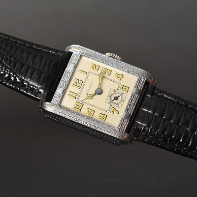 The watch houses the fine 10AN caliber, running well on 15 jewels with sub seconds. It is cased in a classic square shaped hinged 14K white gold filled case with decorations in Art Deco motif on the sides and bezel. It comes with a near mint low dome original mineral crystal and a good crown.