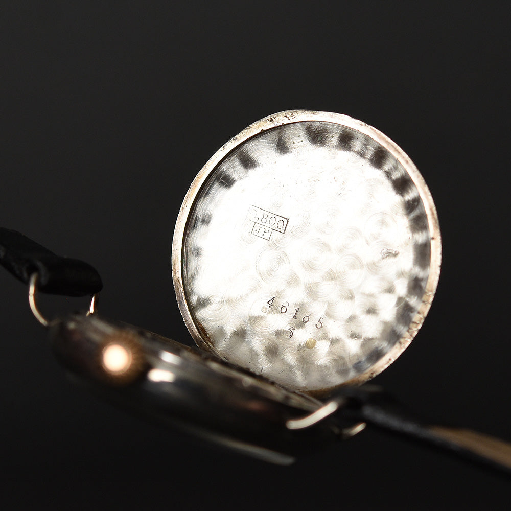 This watch houses an early gilt finish, robust UNIVERSAL caliber running on 15 jewels in manual wind. This strong movement is cased in a Swiss hallmarked JF (Jean Finger) Sterling silver case. This maker is famous for the first Hermetic models in Sterling silver. The case is in great shape with fixed lugs and is relatively small, with a mint original mineral low dome crystal and a original onion crown.