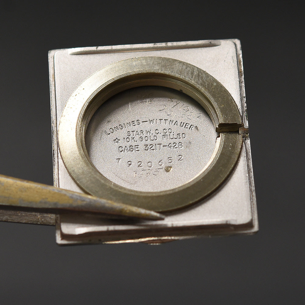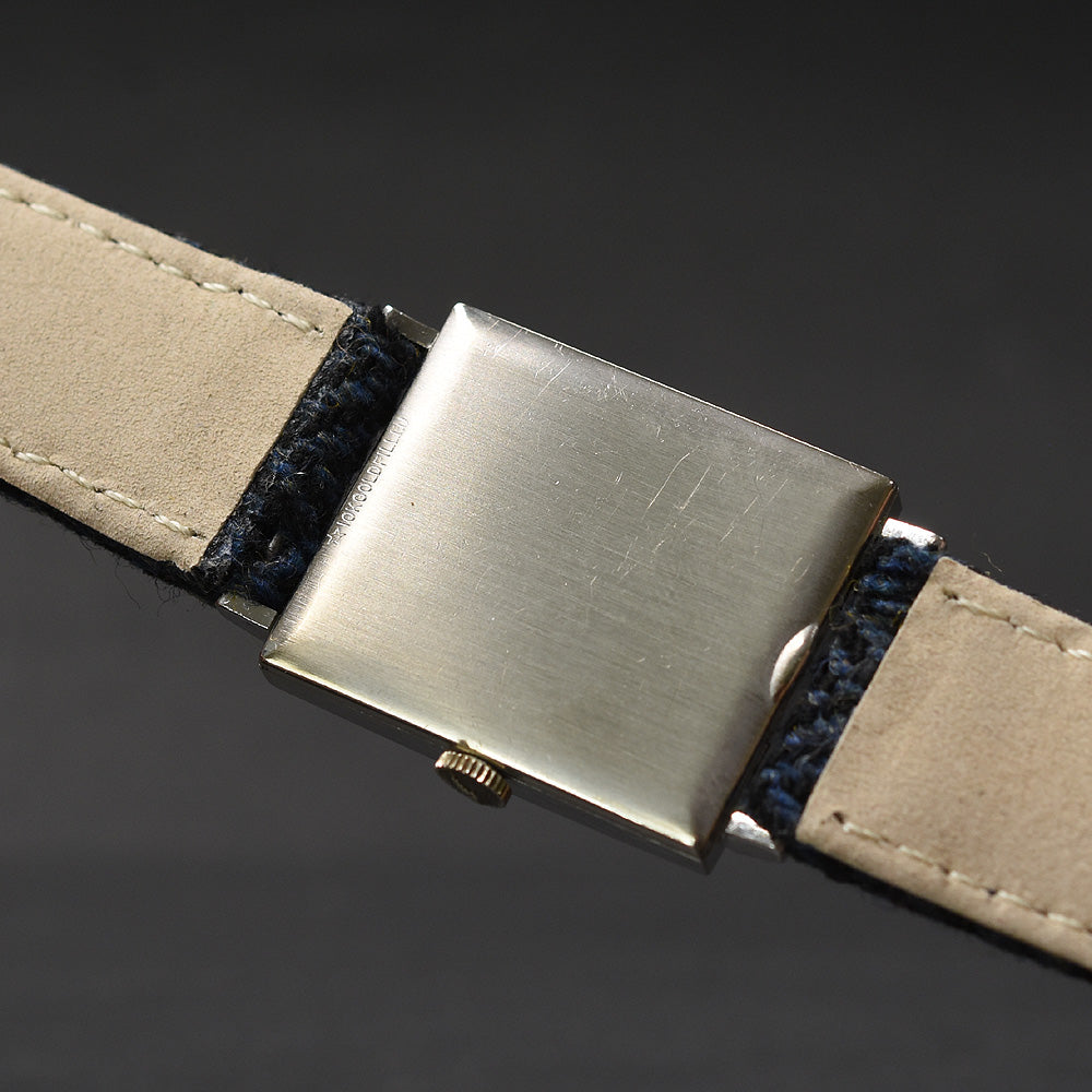 The watch houses a strong 428 hi beat manual wind caliber, running on 17 jewels with no seconds hand. It is cased in rectangular white gold filled case with stainless back, both in excellent condition with a mint crystal and a signed crown.