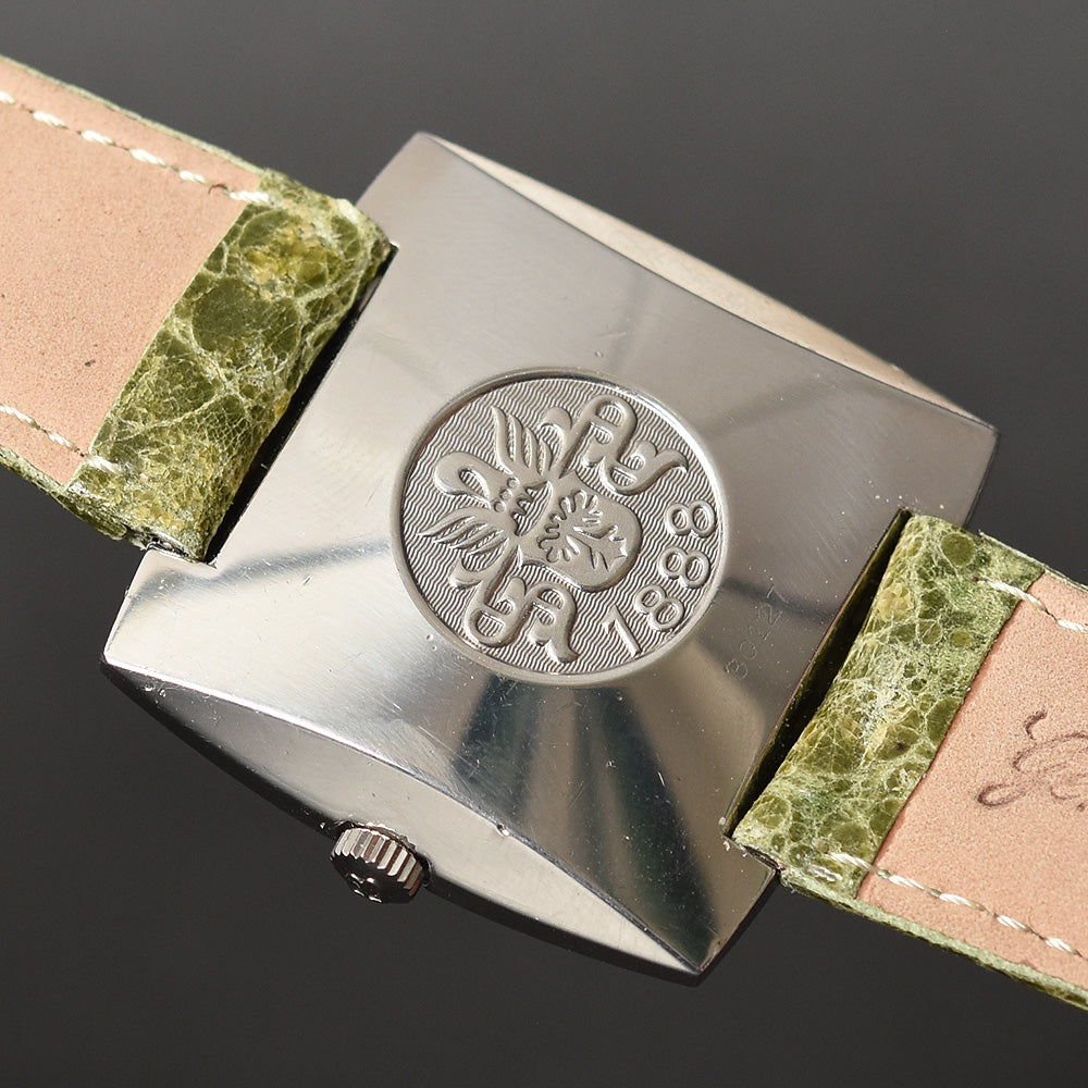 Attached to this chunky Swiss watch is a brand new quality genuine leather band in padded green, 20mm wide, with an anti-allergic buckle in matching tone.