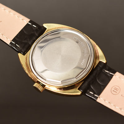 The watch houses a strong 508 hi grade and hi beat automatic wind caliber, running on 17 jewels, with sweep seconds, day and date with quickset by crown press. It is cased in a gold plated chunky case with brushed finish and stainless back, both in very good condition with some minor wear to back edges. It has a good crown and mint crystal.