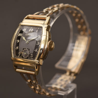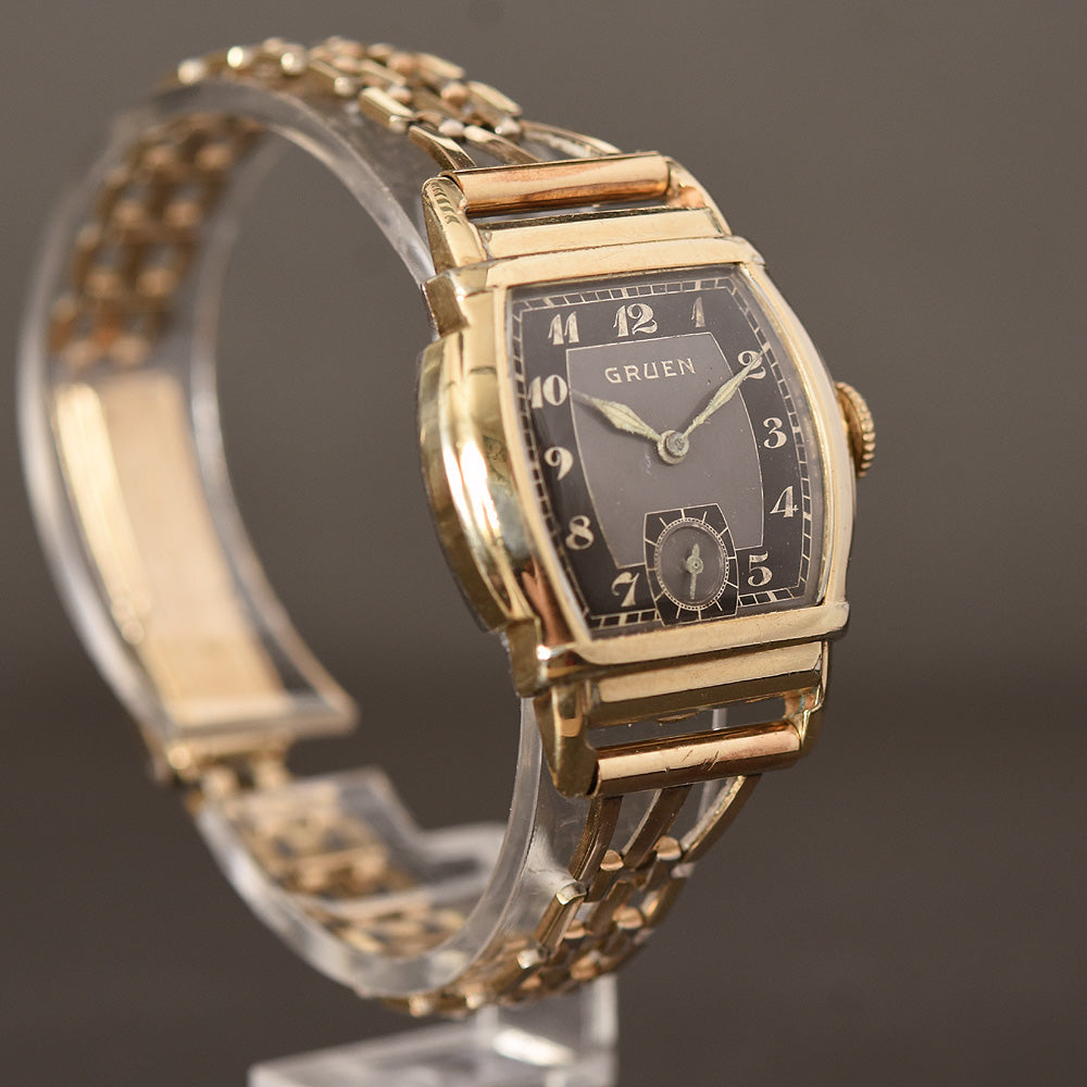 empressissi™ is pleased to offer this original and well preserved GRUEN dress watch for men from the early 40s, in gold filled case with an early Swiss manual wind movement. This model from 1940 is an elegant fusion of Military and Art Deco style.