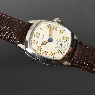 empressissi™ is pleased to offer this early Art Deco GRUEN wrist watch for men - a unique relatively large Cushion shaped model from the late 20s in white gold filled case with a classic Art Deco design.