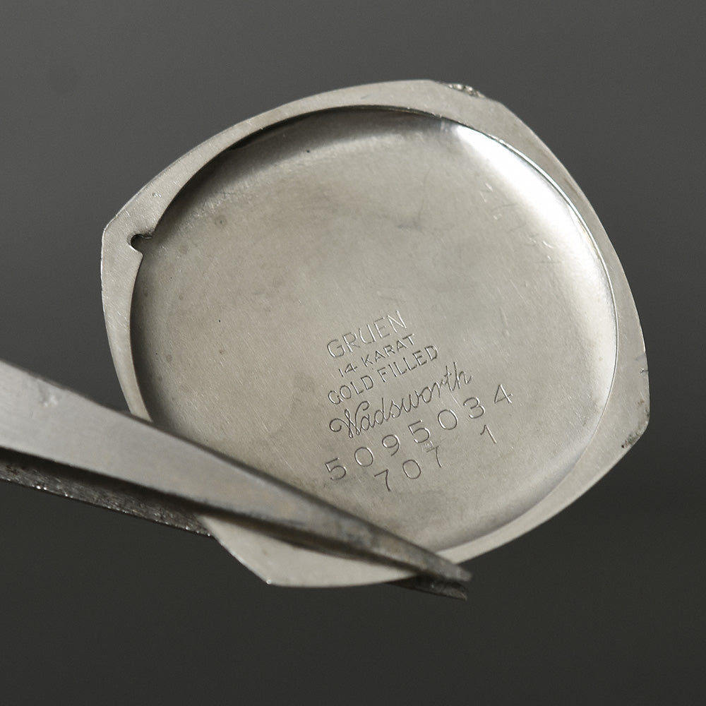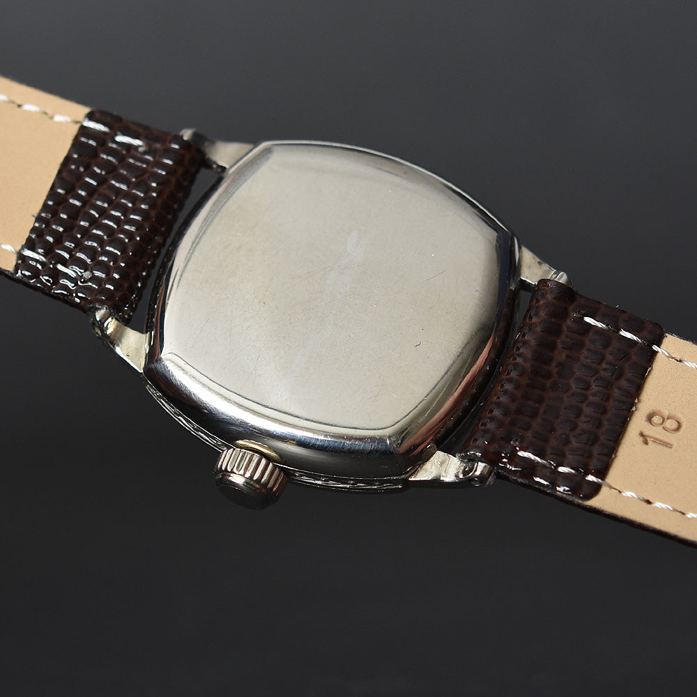 The watch houses an early Guild 705 manual wind caliber, running well on 15 jewels with sub seconds. It is cased in a cushion shaped 14K white gold filled case with modest decorations in Art Deco motif on the sides. The watch has a mint crystal and original crown.