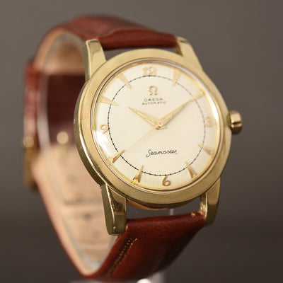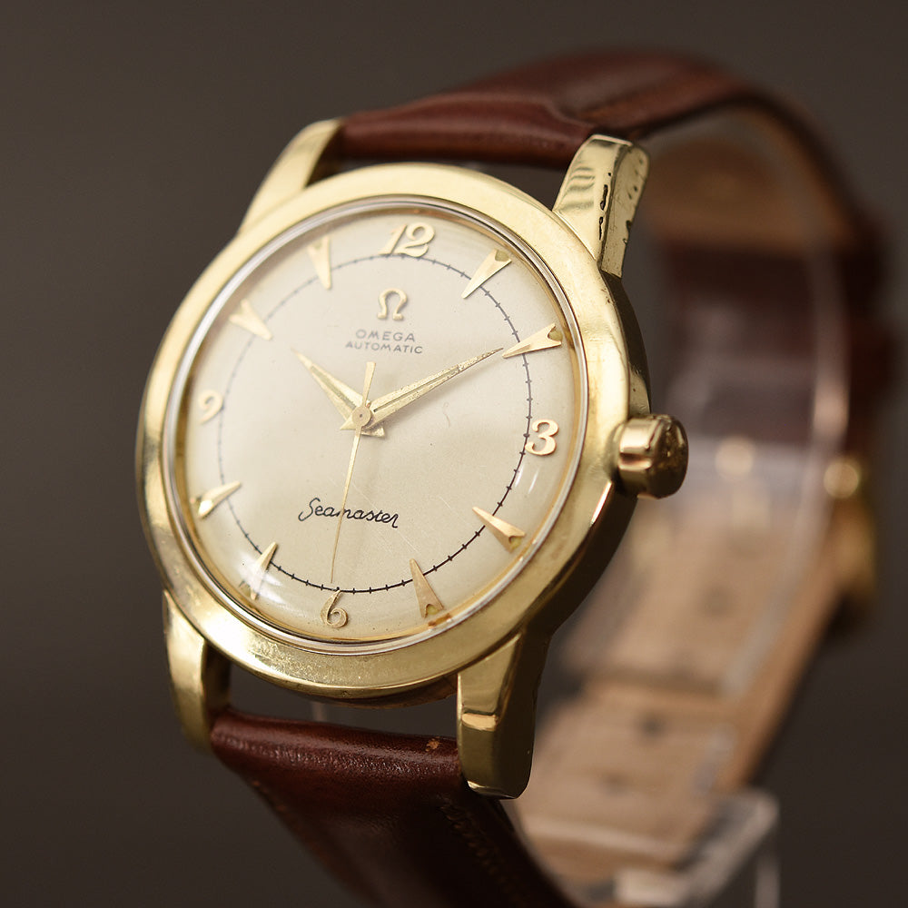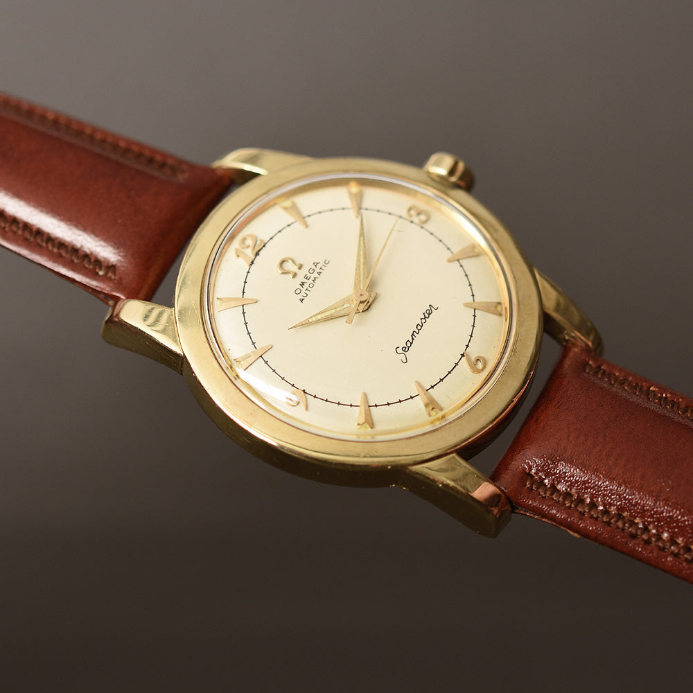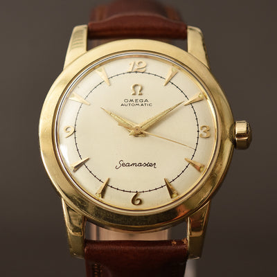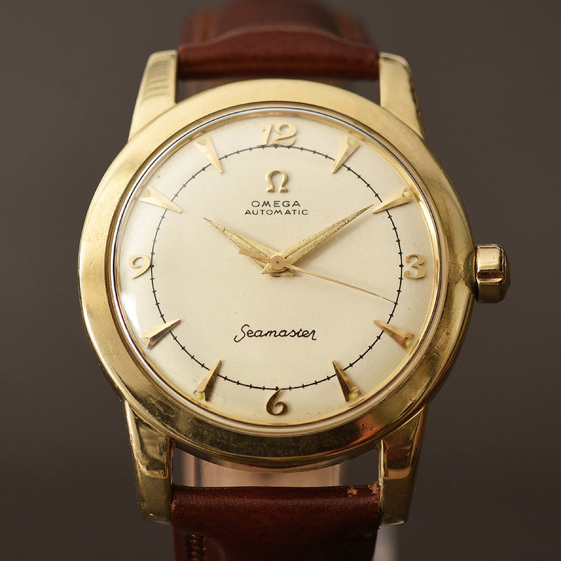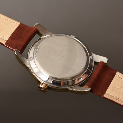 empressissi™ is pleased to offer this fantastic early OMEGA watch for men from the early 50s with classic bumper automatic movement and a design known as Ref G2577 which is a robust stainless steel set with gold cap technology. This timeless watch is ready to wear.