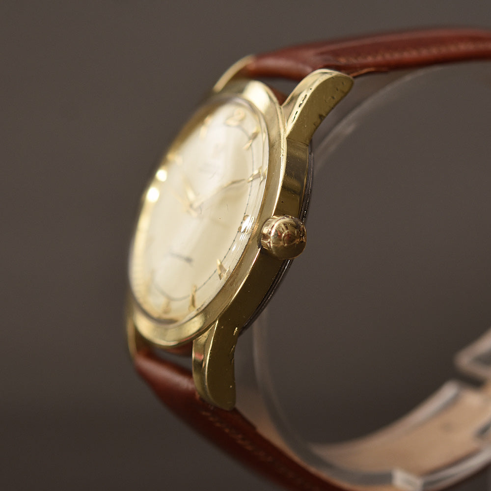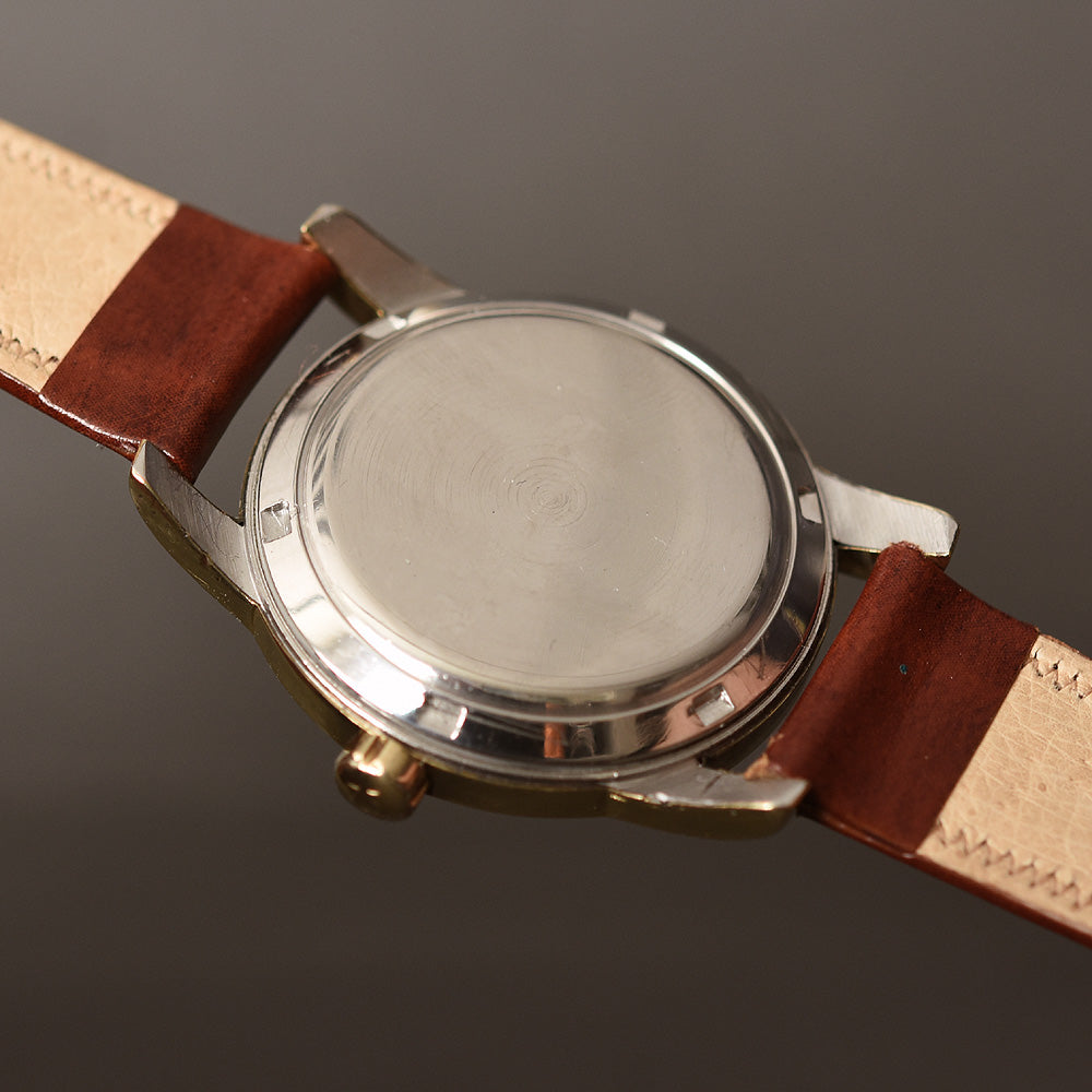 This watch houses a quality 351 caliber with 17 jewels which is a bumper automatic movement with 19,800 beats per hour. It is housed in a stainless steel case with 14K gold cap, both in great condition with little edge wear. It has an original signed crown and a mint generic crystal.