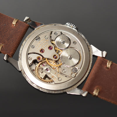 The watch houses a 12.68Z high grade caliber, running on 17 jewels with sub seconds hand. It is cased in an impressive and large all stainless steel case in great shape with original crown and mint low dome crystal.