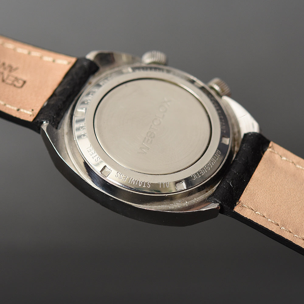 This watch houses a quality AS 1475 base caliber, running on 17 jewels with sweep seconds and is a higher beat version. It has an alarm set by a top crown with crisp sound. The movement is cased in a stainless steel case in excellent condition, still retaining its original finish, with matching crowns and a mint crystal.