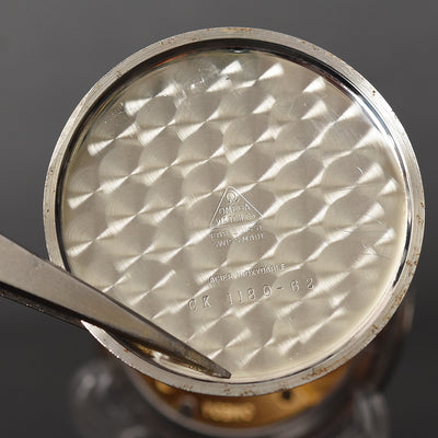 The watch houses an early Swiss OMEGA 181 hi grade caliber, running on 17 jewels. It is cased in an all stainless steel slim case, reference CK 1180-62 for the American market in overall excellent condition with an original bow, crown and near mint signed crystal.