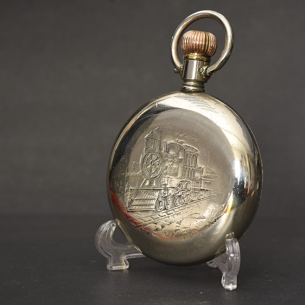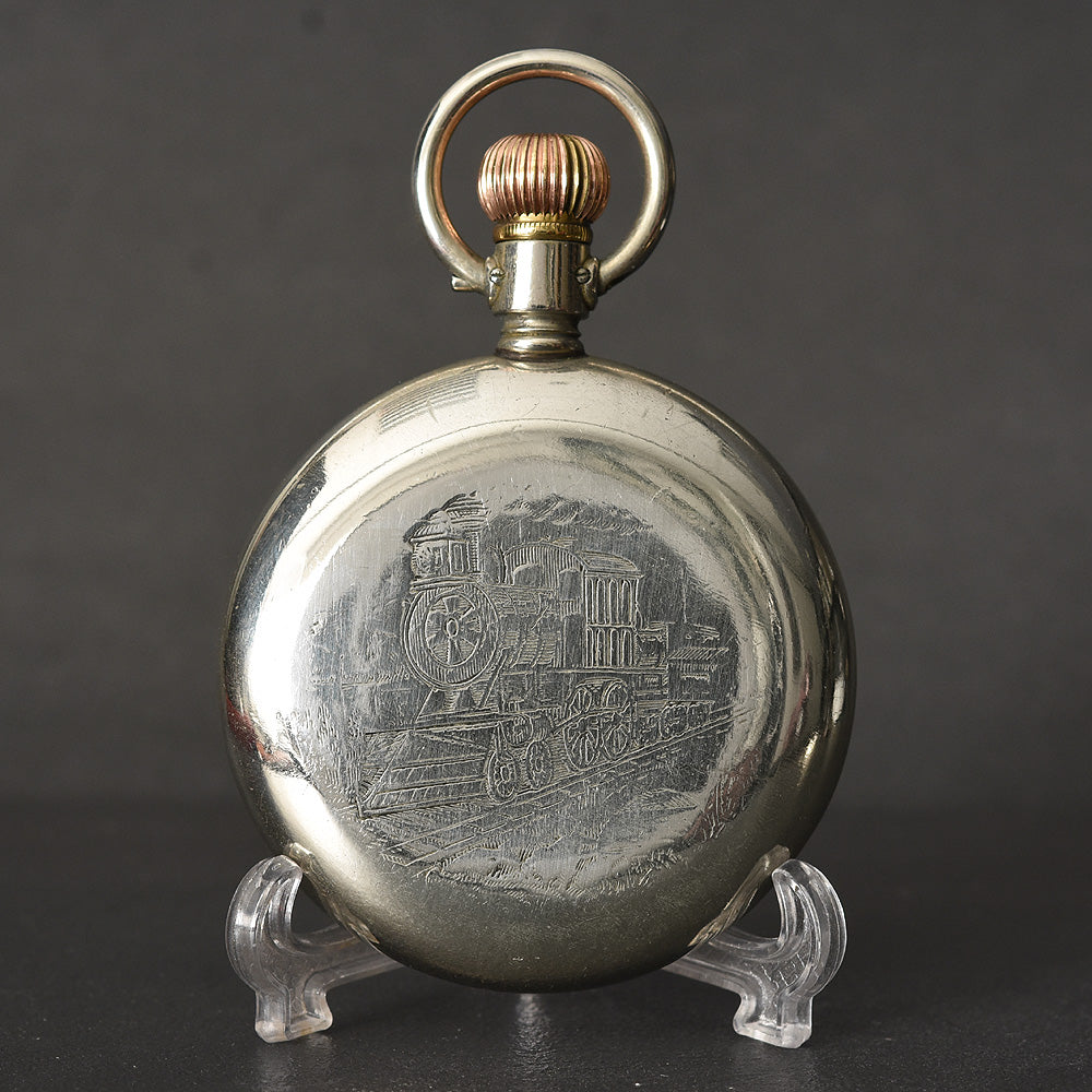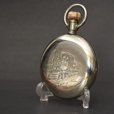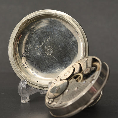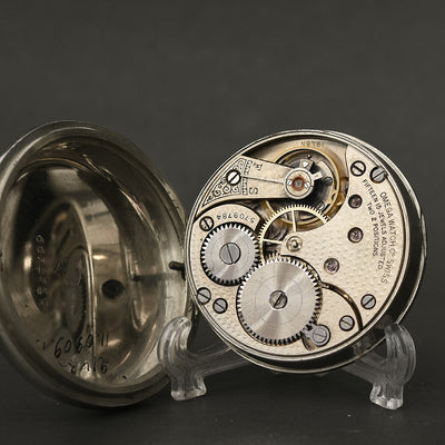 The watch houses an early Swiss OMEGA hi grade movement cal. 19.LBM, running on 15 jewels. It is cased in an original OMEGA signed Nickel case in white tone with a swing out design. The case is in overall excellent shape, with a near mint mineral crystal and original bow and crown.