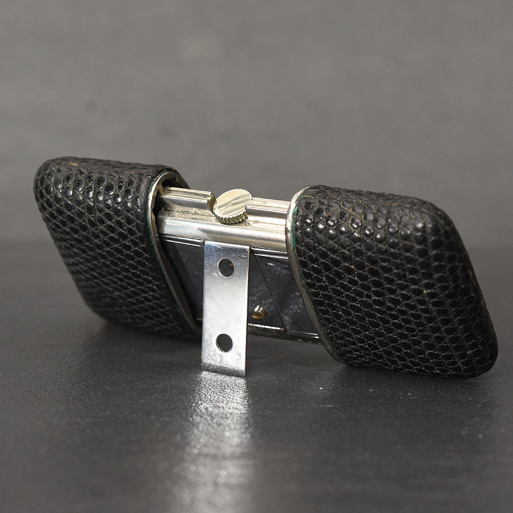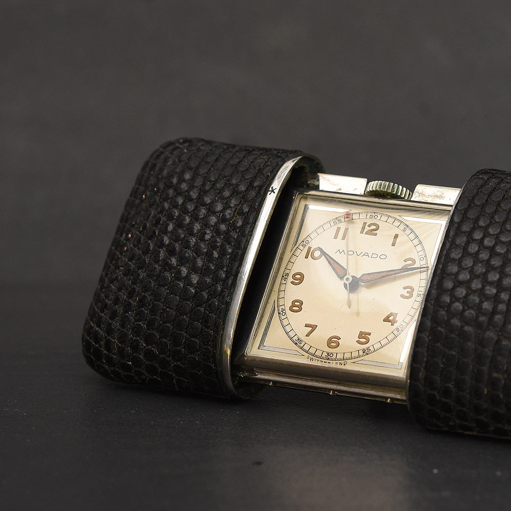 The watch houses an early, hi grade manual wind caliber which is running on 15 jewels and is keeping good time. This version is a manual wind, which means it is not 'automatically' wound up when the two sides slide. Hence it has an original flat crown design. The case is chrome plated all around with good sliding action and comes with a mint original mineral crystal. The leather is in matte black tone and is all intact.