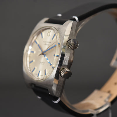This watch houses a quality AS 1475 base caliber, running on 17 jewels with sweep seconds and is a higher beat version. It has an alarm set by a top crown with crisp sound. The movement is cased in a robust stainless steel case in near mint condition, still retaining the original brushed finish, with matching crowns and a mint crystal.